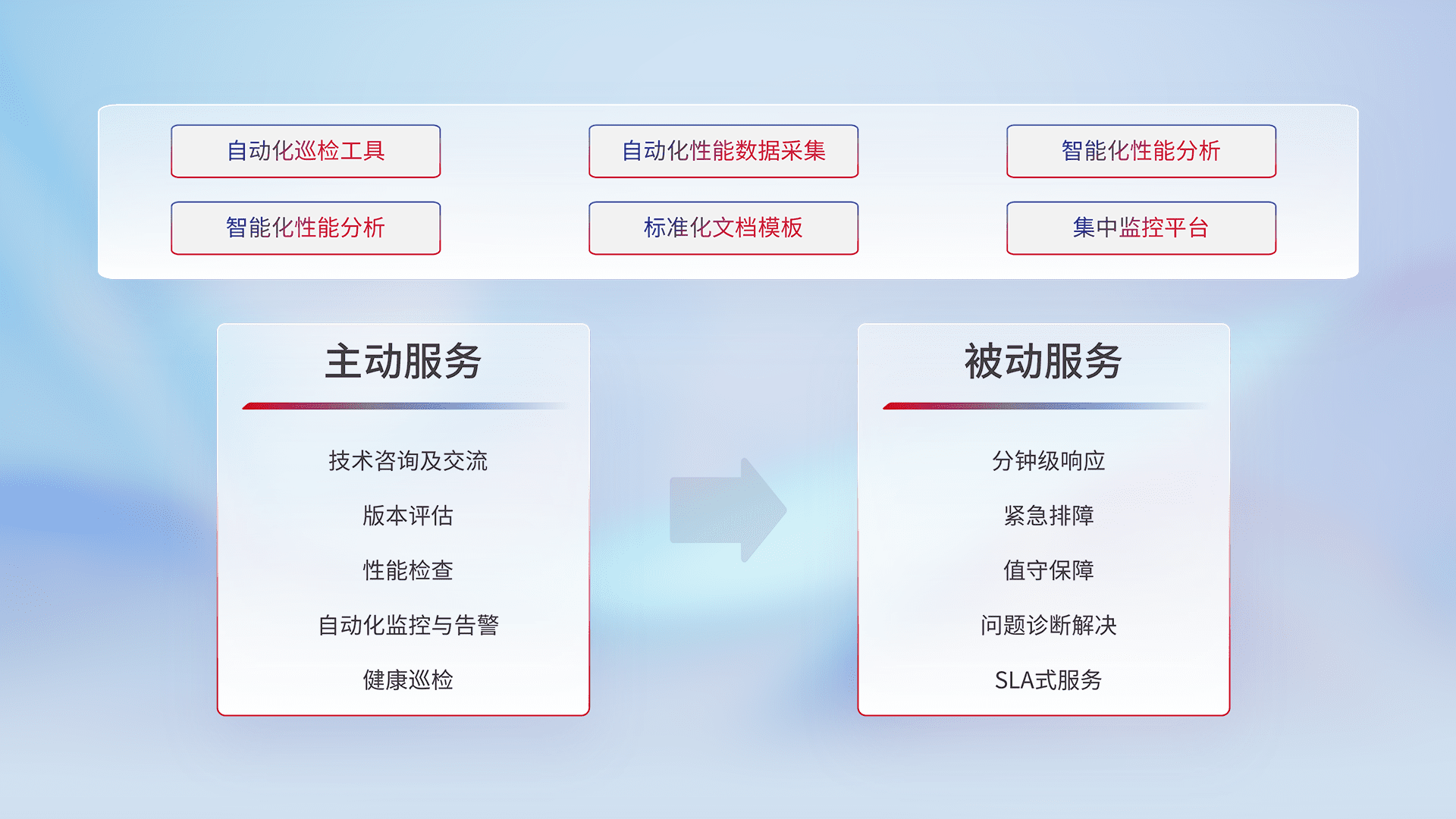 智能化工具和标准化文档,,,,保障服务质量,,,提供主动服务(包含技术咨询、、版本评估、、性能检查、、、、自动化监控与告警、、、健康巡检)和被动服务包含(分钟级响应、、、、紧急排障、、、、值守保障、、、、问题诊断解决、、、SLA服务)。。。