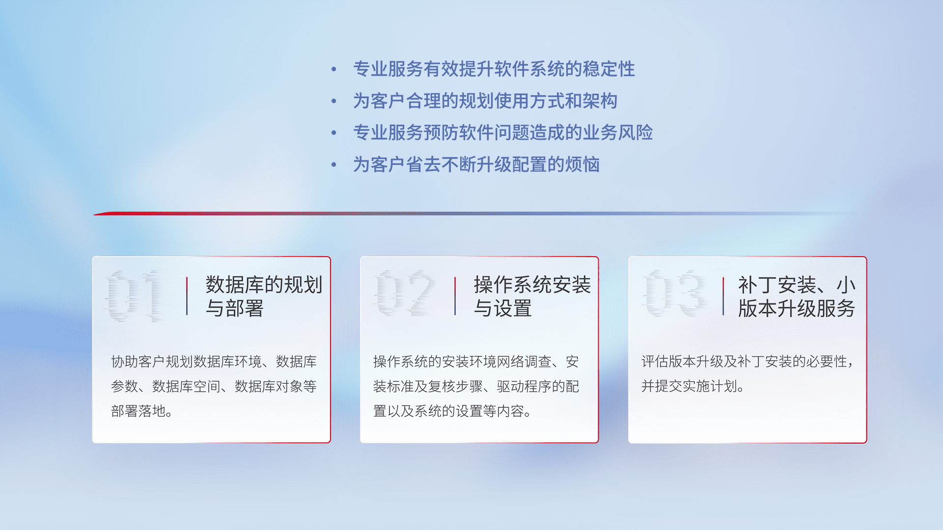 为客户提供软件规模升级、、、、快速部署、、按需配置的专业服务,,,,从数据库的规划与部署到操作系统的安装与设置,,,再到补丁安装和小版本升级提供支持。。